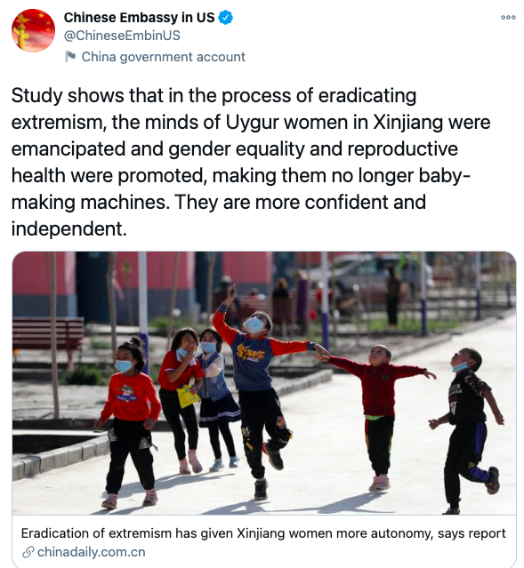 A Embaixada da China nos EUA divulgou em sua conta no Twitter um “estudo” que mostra como a “erradicação do extremismo” foi benéfico para as mulheres uigures – grupo étnico islâmico que vive no extremo oeste da China.