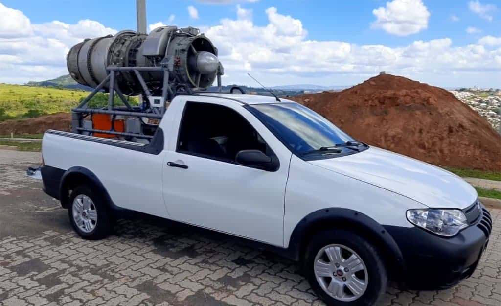 Aliás, ele não tem pós-combustor para fazer o mesmo, mas ainda assim, a Fiat Strada “T-Jet” de Sapucaia do Sul consegue imprimir uma boa velocidade. O proprietário, Diego, demonstra em um vídeo como o motor a jato funciona a bordo de sua picapinha feita em Betim.
